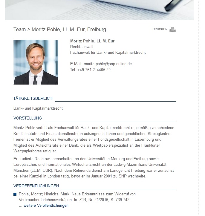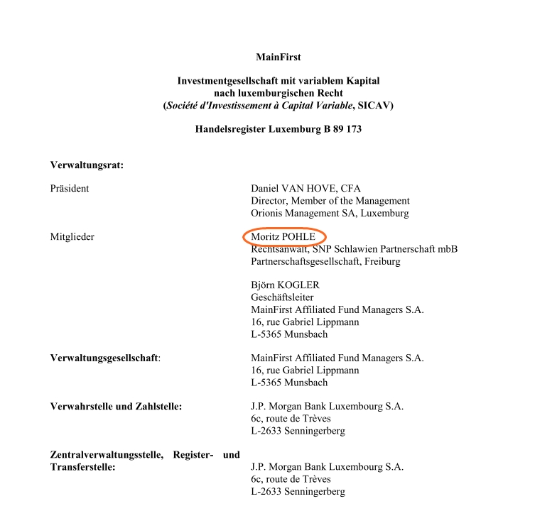 Als ich zum erstenmal hier in Freiburg einen Infozettel zu "Pulse of Europe" erhielt, habe ich mir die kleine Mühe gemacht, den dort als Organisator genannten Herrn Moritz Pohle einmal im Internet zu suchen. Siehe da - nicht nur ist er Wirtschafts-Fachanwalt in der Kanzlei Schlawien und Partner, sondern auch noch Aufsichtsrat in einer Bank und Verwaltungsrat in einer Luxemburger Fondsgesellschaft (siehe dazu die Bilder am Ende dieses Textes).