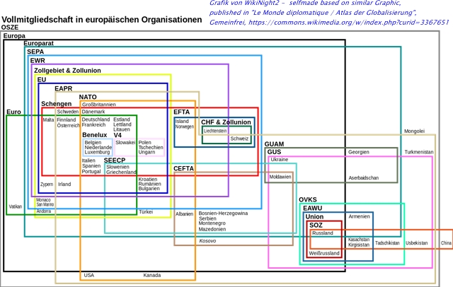 (Obige Grafik wird in Wikipedia dazu benutzt, die Verflechtung der verschiedenen innerhalb Europas tätigen Organisationen zu beschreiben.) |