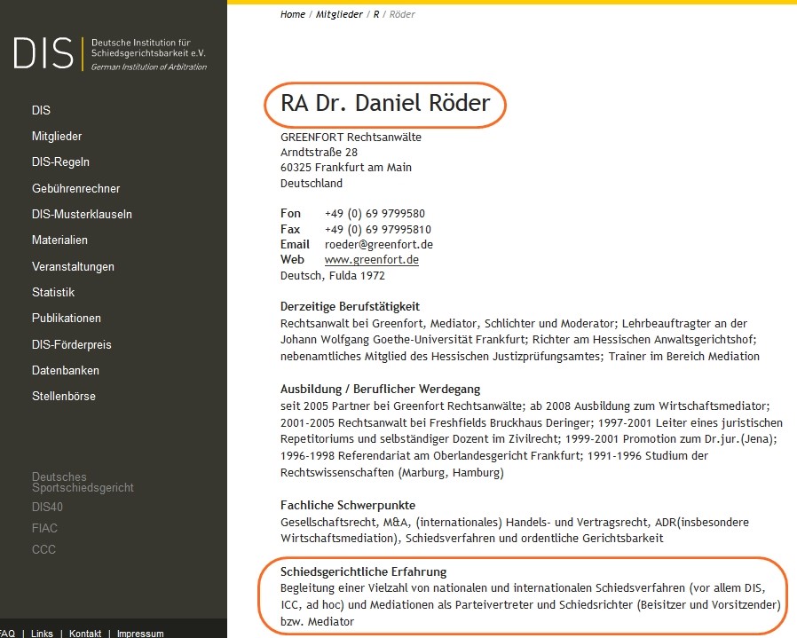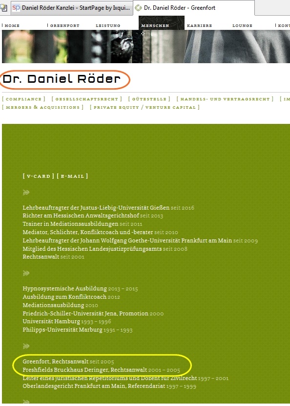 Noch interessanter wird es bei Herrn Dr. Daniel Röder, der offiziell Vorsitzender des (seit Anfang April eingetragenen) Vereins "Pulse of Europe" ist. Auch er ist ein ausgewiesener Wirtschafts-Fachanwalt, nunmehr in der Kanzlei "Greenfort" tätig, nachdem er vorher bei der Kanzlei "Freshfields" unter Vertrag war - jener Kanzlei, bei der sich die Bundesregierung in den vergangenen Jahren so oft "externen Sachverstand" eingeholt hat. Und das Spezialgebiet von Herrn Dr. Röder sind ausgerechnet "nationale und internationale Schiedsverfahren", also wohl auch jene "ISD" oder "investor state disputes", die durch Abkommen wie TTIP und CETA explizit ermöglicht werden sollen (auch hierzu wieder Bilder am Ende dieses Textes).