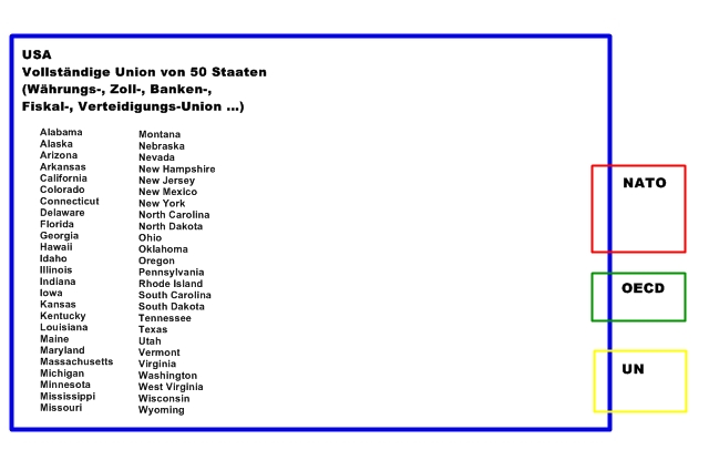 Die Skizze auf der rechten Seite ist zugegebenermassen nicht wirklich das Gegenstück zur Grafik links, sondern sehr vereinfacht, da ja auch die USA in einer Vielzahl internationaler Organisationen Mitglied sind. Insofern, als die Prozesse innerhalb der von mir als Beispiel am Rand angeordneten Organisationen NATO, OECD und UN für den US-Normalbürger praktisch kaum von Belang sind, ist die Sache aber schon stimmig: Die Verachtung der USA für UN-Beschlüsse ist ja schon fast legendär, die OECD versteht sich selbst nur als beratendes Gremium, und dass in der NATO in Vergangenheit und Zukunft nie irgendetwas beschlossen wurde oder wird, was den erklärten Zielen der US-Regierung zuwiderlaufen könnte, ist wohl selbstredend. |
