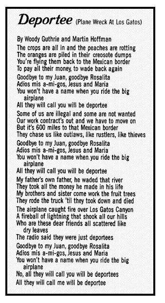 10. Im Jahre 1948 schlug der damals schon legendäre Folksänger Woody Guthrie seine New Yorker Zeitung auf und stolperte über eine Meldung, die von einem Flugzeugabsturz in Kalifornien berichtete. Was seinen zunehmenden Zorn erregte, war, dass in der Meldung die Namen der Besatzungsmitglieder einzeln aufgeführt waren, die restlichen 28 Passagiere jedoch summarisch als "deportees" bezeichnet wurden. Diese vorwiegend mexikanischen Saisonarbeiter waren im Rahmen des US-mexikanischen "Bracero"-Programms von den US-Behörden tatsächlich als "Deportierte" in das Flugzeug gesetzt worden, um zurück nach Mexiko gebracht zu werden. Woody Guthrie verarbeitete das Ganze zu einem zunächst als Sprechgesang aufgeführten Protestlied, dass unter den Namen "Deportee" oder "Plane wreck at Los Gatos" schliesslich weltbekannt wurde. So verschiedene Künstler wie Pete Seeger, Joan Baez oder auch Dolly Parton (neben vielen anderen) nahmen das Lied in ihr Repertoire auf. Es ist sicher zu Recht zu einem Protestsong-Klassiker geworden. Guthrie's "Trick", den deportierten Saisonarbeitern (erfundene) Namen zu geben (Juan, Rosalito, Jesus, Maria,...), lässt sie zu Menschen "wie du und ich" werden, mit deren Schicksal man mitfühlen kann. Und mit "Jesus und Maria" wählte er sicher mit Absicht zwei Namen, die jedem christlich erzogenen US-Bürger geläufig sein mussten und das Leid der mexikanischen Migranten mit der Leidensgeschichte des Neuen Testaments verknüpften *7. 50 Jahre nach Guthrie's Tod, 70 Jahre nach seiner Entstehung, wird das Lied immer noch gespielt *8 und wirkt immer noch aktuell. Das bedeutet aber bestürzenderweise auch, dass die im Lied beklagten Umstände tatsächlich fast genauso wirksam sind wie vor 7 Jahrzehnten: Die gefährliche Passage von Mexiko nach Norden, die alltäglichen Anfeindungen im fremden Land, die beständige Furcht vor Entdeckung, Einkerkerung und Deportierung.