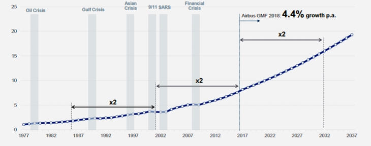 5. Flugverkehr Ein medial m.E. sehr unterbelichtetes Thema ist die Rolle der internationalen Passagierluftfahrt bei der Verbreitung von Epidemien. Herr Harari ist da mit einem Satz schon sehr nahe dran, wenn er (wiederum vermenschlichend) davon spricht, dass "ein Virus heute mit der Business class in 24 Stunden um die Welt reisen und Millionenstädte infizieren" könne ("Today a virus can travel business class across the world in 24 hours and infect megacities of millions"). Schon im nächsten Satz beruhigt er den Leser, dass sowohl Anzahl als auch Umfang grosser Epidemien trotzdem in letzter Zeit "dramatisch zurückgegangen" seien, und er führt dies auf sein Lieblingsmotto "nicht Isolation, sondern Information" zurück. Wenn wir uns die Frage stellen, warum aber z.B. die SARS-Epidemie von 2003 (die weltweit 800 Todesopfer forderte) soviel weniger schlimm verlief als die aktuelle COVID-19-Krise (aktuell [2.4.] weltweit über 40'000 Opfer), dann würde meine Antwort auf 2 Hauptaspekte abzielen: a) Covid-19 ist schlicht "biologisch-technisch" anders als SARS-2003. So wie ein Kettenfahrzeug anderes Terrain bewältigen kann als ein normales Radfahrzeug, so überwindet Covid-19 andere biologische Barrieren als andere Viren. Dazu kommt wohl noch die ungewohnte Kombination von hoher Infektiösität mit geringer Letalität für z.B. junge Menschen (übrigens der einzige Lichtblick für Länder wie Indien oder Nigeria - die vergleichsweise junge Bevölkerung). b) Die enorm gewachsene internationale Mobilität vieler Menschen. Im Jahr 1970 war die Wahrscheinlichkeit für einen Mitteleuropäer, bis auf Armlänge an einen Chinesen (noch dazu speziell aus Wuhan) zu kommen, nahezu null. 1980 war dieselbe kaum höher, 1990 dann definitiv nicht mehr null, und spätestens seit 2000 steigt die Wahrscheinlichkeit steil an - siehe die Passagierzahlen des internationalen Luftverkehrs. In einer Publikation*7 vom Februar dieses Jahres wird diese Grafik präsentiert: