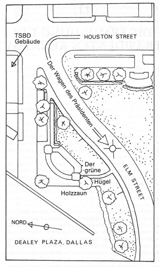10. Zurück zum Tatort und zum angeblichen Einzeltäter Oswald. Betrachten wir eine Skizze dazu: