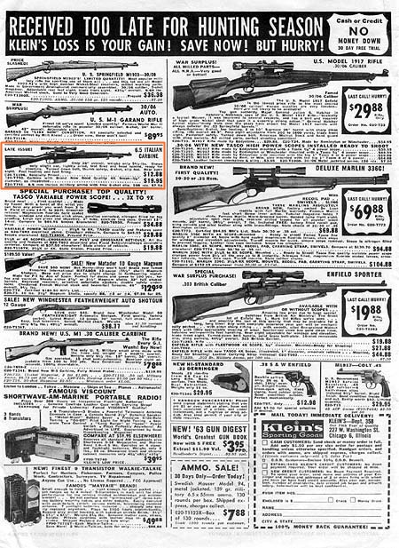 6. Wie aber kam nun Mr. Oswald ausgerechnet an ein italienisches Gewehr, angeblich genau zu dem Zweck angeschafft, einen berühmten Politiker zu ermorden? Schliesslich gab und gibt es in den USA eine Vielzahl von Firmen, die sich auf die Fertigung von Schusswaffen spezialisiert haben, er hätte also auch aus verschiedensten "heimischen" Produkten wählen können. Das soll (erstaunlicherweise) angeblich eine Preisfrage gewesen sein, denn auf dem Anzeigenblatt der Firma "Klein"s Sporting Goods", welches L.H. Oswald studiert haben soll, gehörte es mit unter 20 US-Dollar *3 (inclusive Zielfernrohr!) zu den billigsten aufgeführten Gewehren: