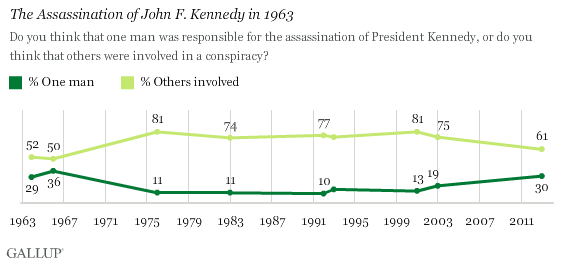 9. Vielleicht ungewollt sind wir an einem der vielen Punkte angelangt, wo "etwas nicht passt". Oliver Stone schildert das in seinem "JFK"-Film sehr schön an der Person des Staatsanwaltes Garrison. Jener geht zunächst ganz gutgläubig an die Lektüre des Warren-Reports, stolpert dann aber immer wieder über Ungereimtheiten, Implausibilitäten, widersprüchliche Aussagen und so fort. Ein Hauptzweck der von Präsident Johnson mit eingesetzten Warren-Kommission war sicherlich, die Unsicherheit in der US-Bevölkerung über den oder die Urheber des Attentats zu beenden. Und trotz der damals prominenten Kommissions-Mitglieder (heute dürfte - neben dem Vorsitzenden Earl Warren vom Obersten Bundesgericht - nur noch Gerald Ford, der spätere Präsident, geläufig sein), waren laut Angaben des Meinungsforschungsinstituts GALLUP niemals mehr als 36% der US-Amerikaner von der Einzeltäter-Hypothese des Berichts überzeugt, während immer mindestens 50% (bis zu 81%!) *6 überzeugt waren, dass andere Personen ausser Lee Harvey Oswald am Attentat beteiligt waren:
