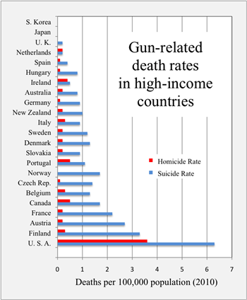 8. Die "westliche Wertegemeinschaft" ("WWG?") Ein immer wieder in der Konfrontationsrhetorik benutzter Begriff ist der der "westlichen Wertegemeinschaft". Er erfüllt in Bezug auf die NATO eine ganz ähnliche Funktion wie der Begriff "europäische Idee" in Bezug auf die EU: Beidesmal sind es Begriffe, die ein hochstehendes moralisches Ziel umschreiben sollen, die aber vorsichtshalber nie mit konkreten Inhalten gefüllt werden. Dass die Länder etwa Westeuropas gerade in den Nachkriegsjahrzehnten eine gewisse kulturelle Nähe zu den "transatlantischen Partnern" USA und Kanada entwickelt haben, wird kaum jemand leugnen wollen. Aber was wären denn konkrete Punkte, die die "westlichen Wertegemeinschaft" nun ausmachen? Vielleicht die Todesstrafe, die in den Gründungsstaaten der EU bzw. EWG *7 seit Jahrzehnten abgeschafft ist? In der Führungsnation der NATO, den USA, ist dieselbe allerdings durchaus nicht abgeschafft. Alternativ könnte man nach gesellschaftlichen Standards Ausschau hallten, etwa so etwas Grundlegendes wie Mutterschaftsurlaub. In den meisten EU-Staaten wird schon seit Jahrzehnten ein solcher gewährt, 10 bis 20 Wochen sind hier der Standard. Und in den USA? Dazu weiss die Wikipedia: "Es bestehen keine gesetzlichen Regelungen zum Mutterschaftsurlaub oder zur Gehaltsfortzahlung." Das Recht auf körperliche Unversehrtheit kennen in der einen oder anderen Form die meisten NATO-Staaten, aber dazu gehört natürlich auch, dass der Staat dieselbe auch einigermassen sicherstellen kann. Wenn es aber um Tod durch Schusswaffengebrauch geht, stehen wieder die USA einsam an der Spitze *8: