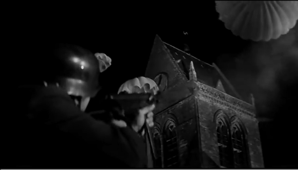 2. Sainte-Mere-Eglise In der Nacht vor der eigentlichen Invasion wurden Fallschirmjäger an verschiedenen Punkten im Hinterland des Invasionsgebietes abgesetzt, wo sie z.B. wichtige Brücken entweder besetzen und sichern oder sprengen sollten. Eine Gruppe US-Paratrooper wurde dabei weitab von der geplanten Landezone abgesetzt, die Soldaten schwebten mitten auf den Kirchplatz des kleinen Städtchens Sainte-Mere-Eglise. Auch die deutschen Besatzer waren schon auf diesem Platz, und als die ersten US-Soldaten landeten, eröffneten sie zunächst mit Handfeuerwaffen, dann mit schweren Maschinengewehren das Feuer auf die Unglücklichen: