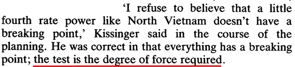 Übersetzt: >"Ich weigere mich zu glauben, dass eine kleine viertklassige Macht wie Nord-Vietnam keinen Bruchpunkt haben sollte", sagte Kissinger im Verlaufe der Planungen. Er hatte vollkommen recht in der Feststellung, dass alles einen Bruchpunkt hat; der Test ist das Mass der benötigten Kraft [bzw. Gewalt].< Das ist eigentlich nicht anders als in einer Materialprüfungsanstalt, wo man die Belastbarkeit von irgendwelchen Werkstoffproben ermittelt: Indem man die Kraft der hydraulischen Apparate soweit steigert, bis das Bauteil bricht. Insofern erübrigt sich die Frage, ob man irgendein Land besiegen könne oder nicht - jedes Land kann "gebrochen" werden. Sondern es ist die Frage zu stellen, wieviel Gewalt man denn zur Erreichung des Ziels (Sieg durch Brechen des Widerstands) aufzubringen bereit ist *3. Und natürlich ist auch Russland besiegbar, die dafür nötigen Gewaltmittel lagern beispielsweise in den US-Raketensilos für Interkontinentalraketen, oder als Atombomben in der Eifel im Rahmen der sogenannten "nuklearen Teilhabe". Die Gewaltmittel sind also da, die Frage ist also eher, bis zu welcher Eskalationsstufe Herr Thumann dieselben einzusetzen bereit wäre, um Russland endlich die angestrebte Niederlage beizubringen? Denn dass man eine solche herbeiführen müsste, ist die unhinterfragte Prämisse des ganzen Textes.