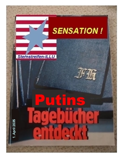 Heute, der 31.04.2035, im Archivkeller Professor Tarantogas "Archivkeller"war leichter zu finden, als angenommen: Der Besitzer hatte einst in grossen Lettern KNOW YOUR ENEMY ! auf die Eingangstür gepinselt. Kurz vor seiner Abreise nach Asien hatte mir Tarantoga den Schlüssel zu diesem Keller geradezu aufgedrängt. Bei meinem ersten Besuch dort, einem erstaunlich tief in den weichen Stein hineingetriebenen ehemaligen Winzerkeller, staunte ich über die Unmengen an alten Büchern, vergilbten Zeitungen und Zeitschriften, die der sammelwütige Professor da angehäuft hatte. Auch über die Regale mit allerlei Krimskrams, zu dem wohl nur Tarantoga selber sagen könnte, warum diese Sachen ihm aufhebenswert erschienen. Allerdings - das Regal mit den Konservendosen aus aller Welt, die er wohl nur der bunten und vielsprachigen Banderolen wegen gesammelt hatte, sollte mir noch sehr nützlich werden - aber ich greife voraus. Jedenfalls - obige Auszüge aus den Tagebuch-Veröffentlichungen der Sternstreifen-ILLU basieren auf jenen Archivfunden. Im Archiv fand ich ebenso Exemplare des Magazins STERN aus dem Jahre 1983, als man dort mit grossem Getöse die Entdeckung der "Hitler-Tagebücher" bekanntgab - und wenige Wochen später zugeben musste, dass alles eine Fälschung eines begabten Kunstmalers namens Konrad Kujau war. Die "Putin-Tagebücher" scheinen mir, soweit ich mich an die gar nicht so goldenen 20er-Jahre erinnern kann, vom Inhalt her jedenfalls nicht unplausibel. Den alten Ratschlag "know your enemy" scheinen die politischen und medialen Eliten im Westen damals jedoch gründlich vergessen zu haben. Einerlei: Ob die "Putin-Tagebücher" eine Fälschung wie damals in den 1980ern sind, werden wir wohl nie mehr erfahren, weil...